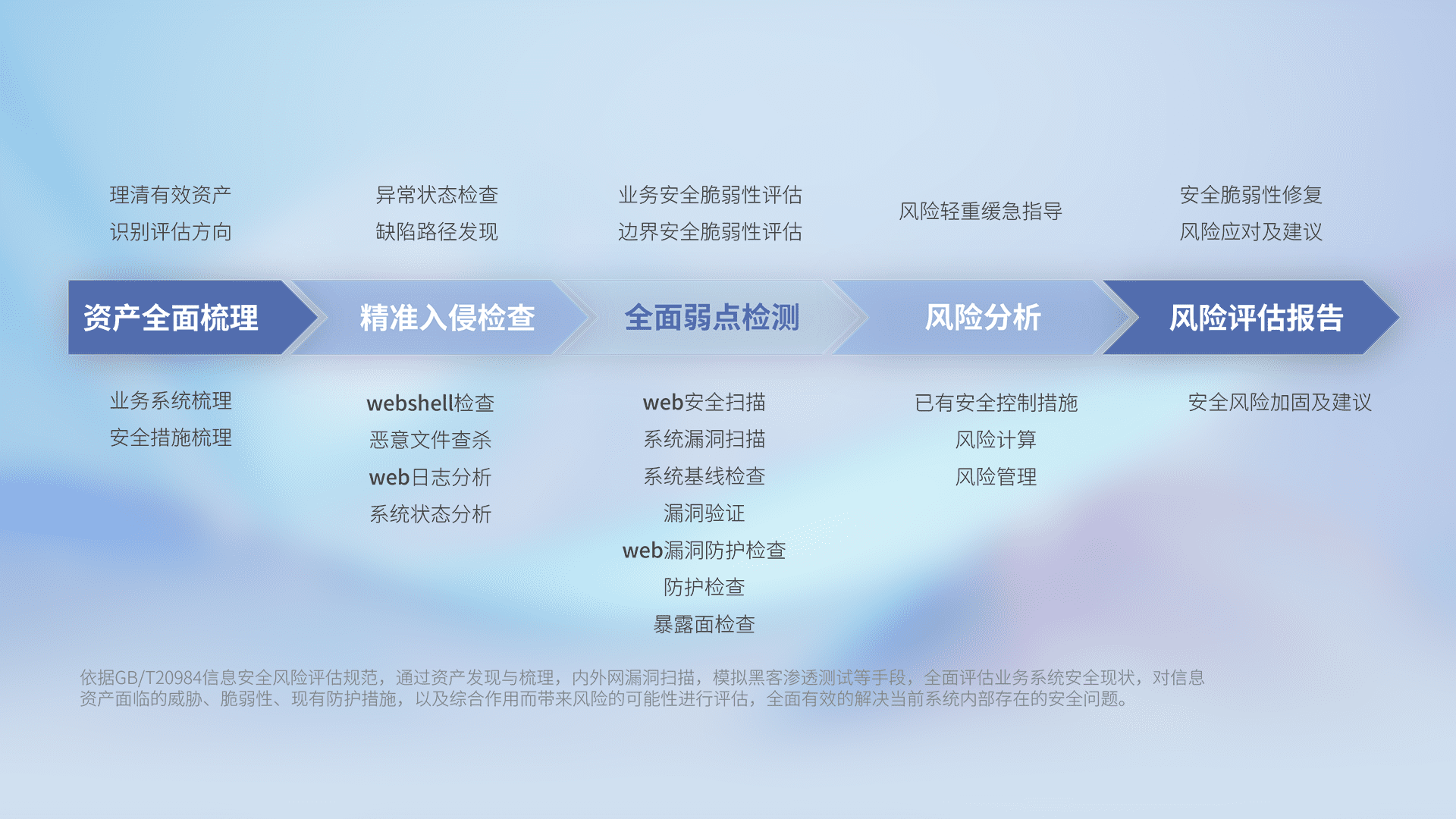 针对客户行业特性,,,,以专业的安全服务+多厂商联合解决方案提供专属的一站式安全管理服务,,,帮助客户全面感知网络空间威胁,,,,基于识别、、检测、、分析、、、防护、、监测、、、、响应的服务理论模型,,,从方案咨询、、、、集成交付、、评估验证、、优化加固、、、运维运营,,,致力于为客户提供完整的闭环管理式安全服务。。。以实战经验为客户打造高抵御风险的安全体系,,帮助客户发现威胁、、、对抗威胁、、、、处置威胁,,,,不断积累安全对抗能力,,,持续保障数字化安全。。。